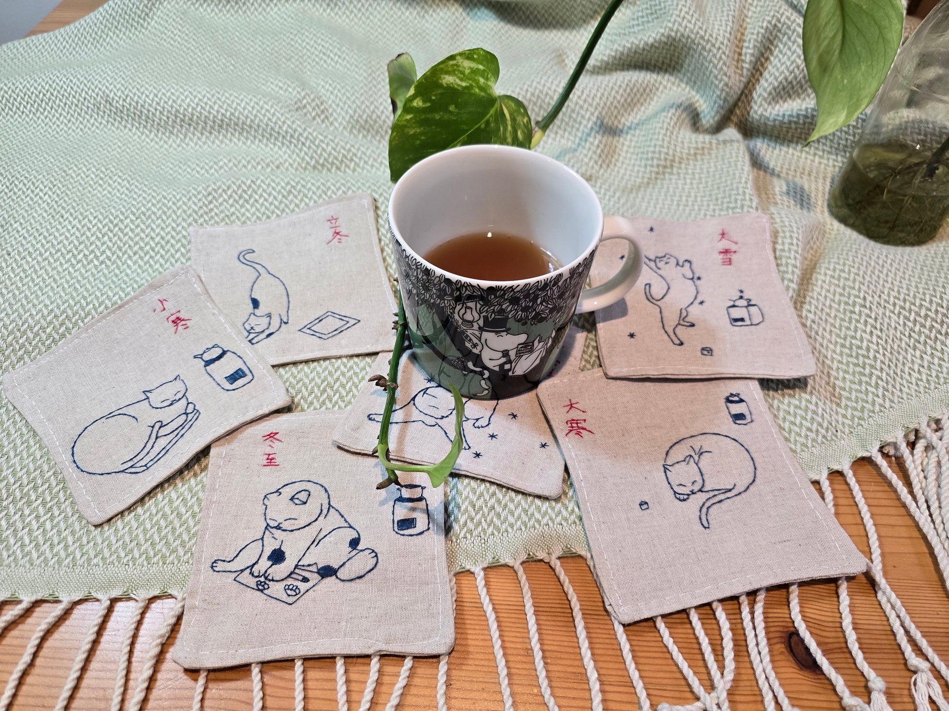 Hand Embroidered Linen Cat Coasters – Chinese Solar Terms, Set of 6